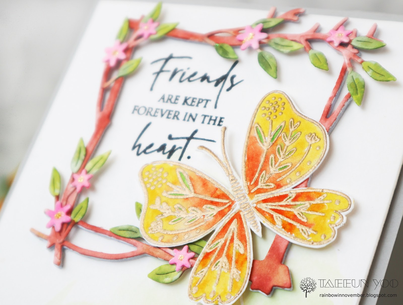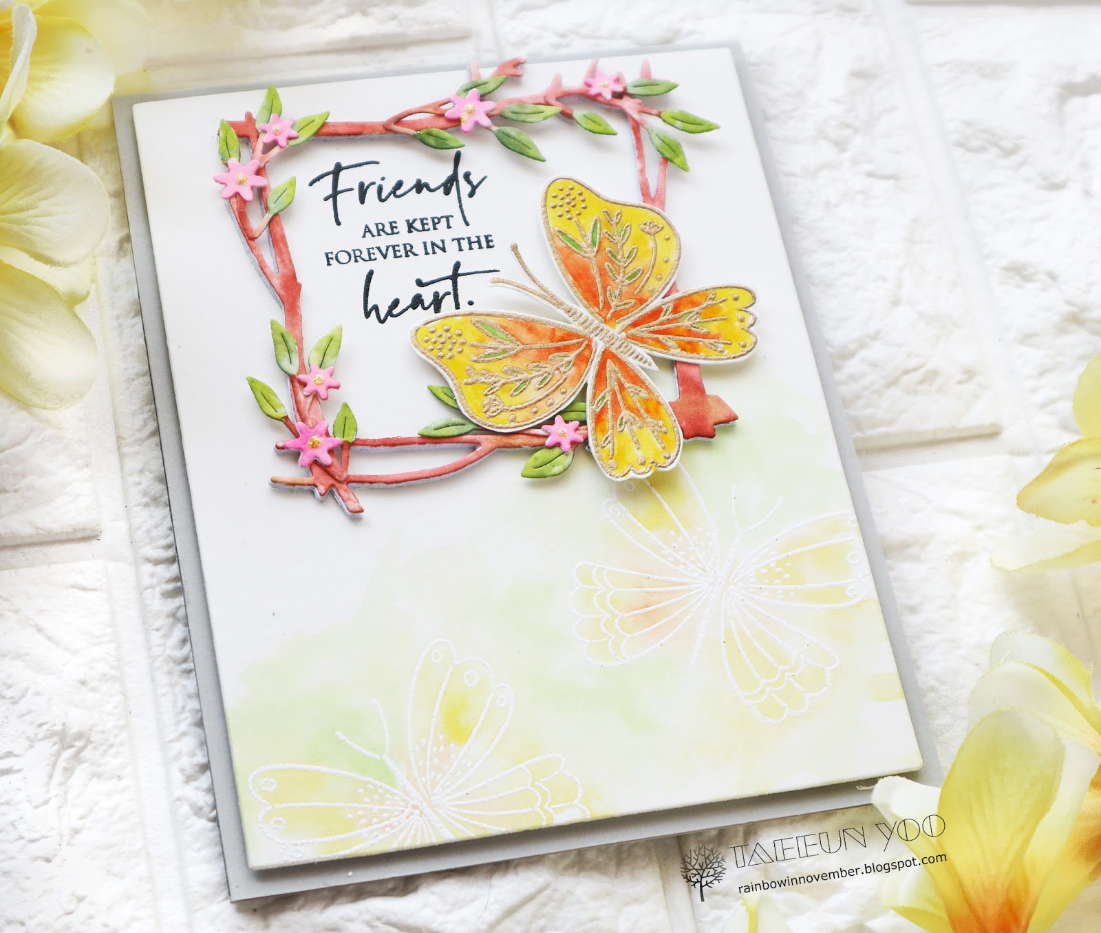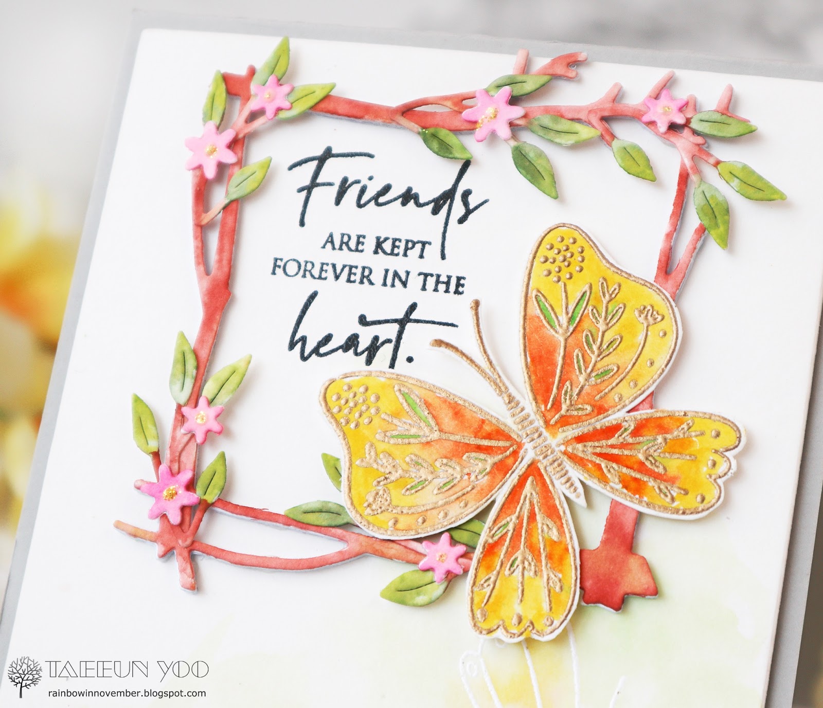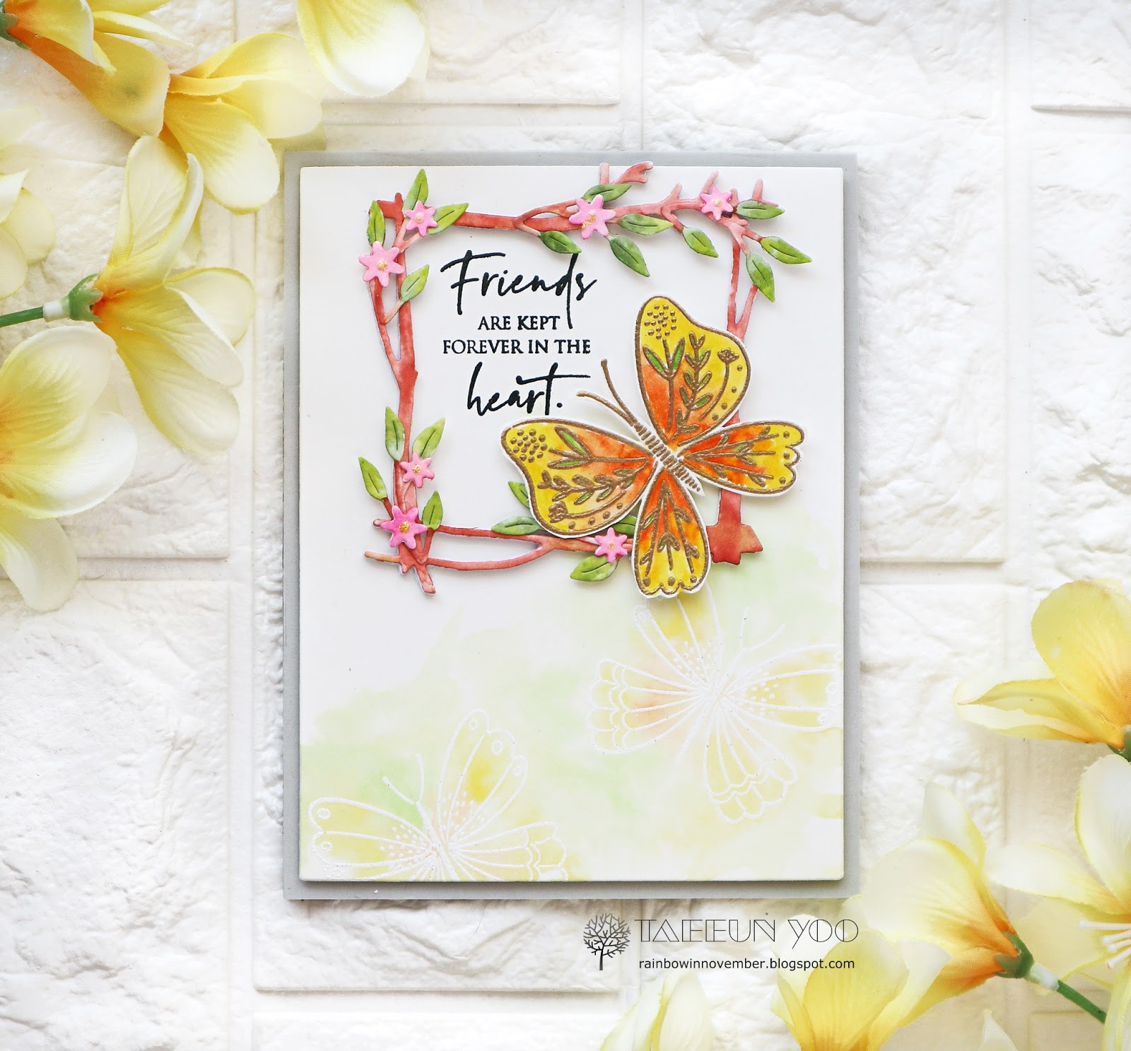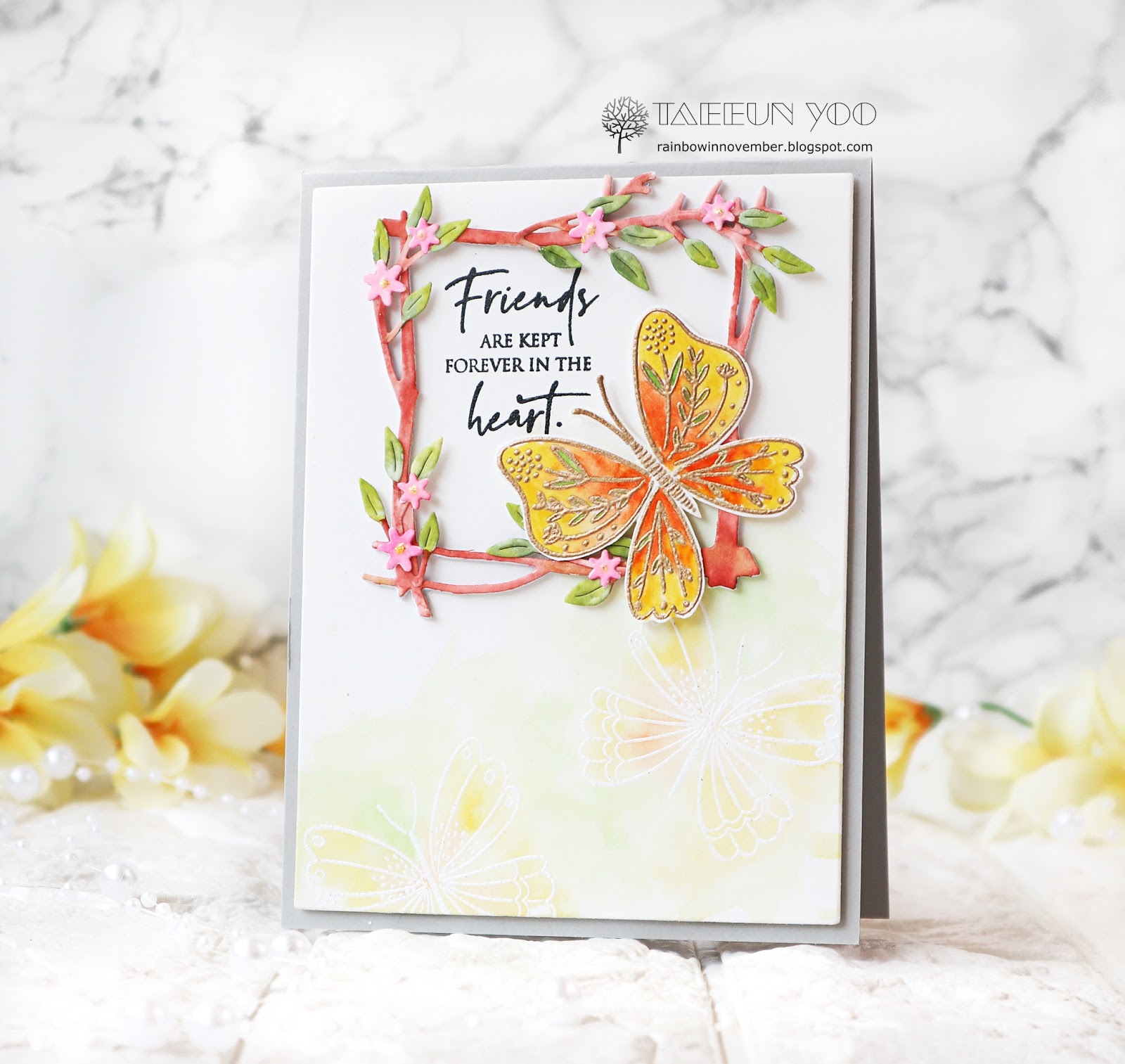 I stamped the sentiment from Magical Friendship (30-707) set in a black pigment ink on the background panel and clear heat embossed it. I trimmed down the background panel a bit and foam mounted it on a gray cardbase. I then added the colored Branch Frame (51-624) stacked on some die cut frame from white cardstock to the card. I then embellished the frame with the branches and little flowers and placed the butterfly on the frame. I added yellow Stickles on the center of the flowers to finish off the card.