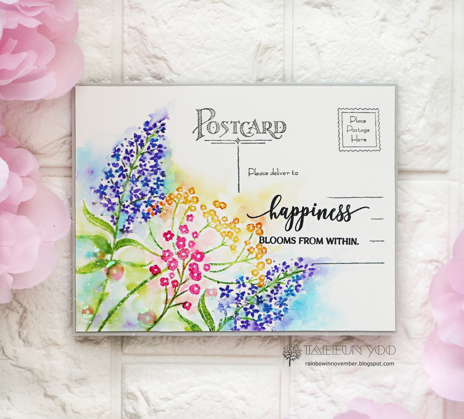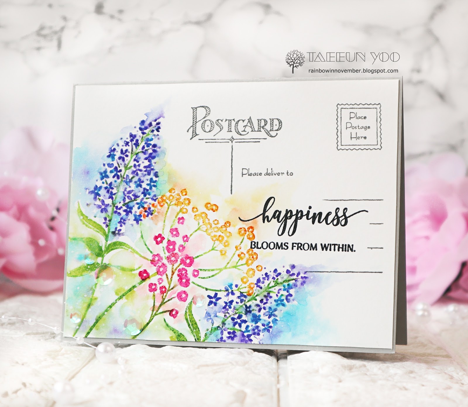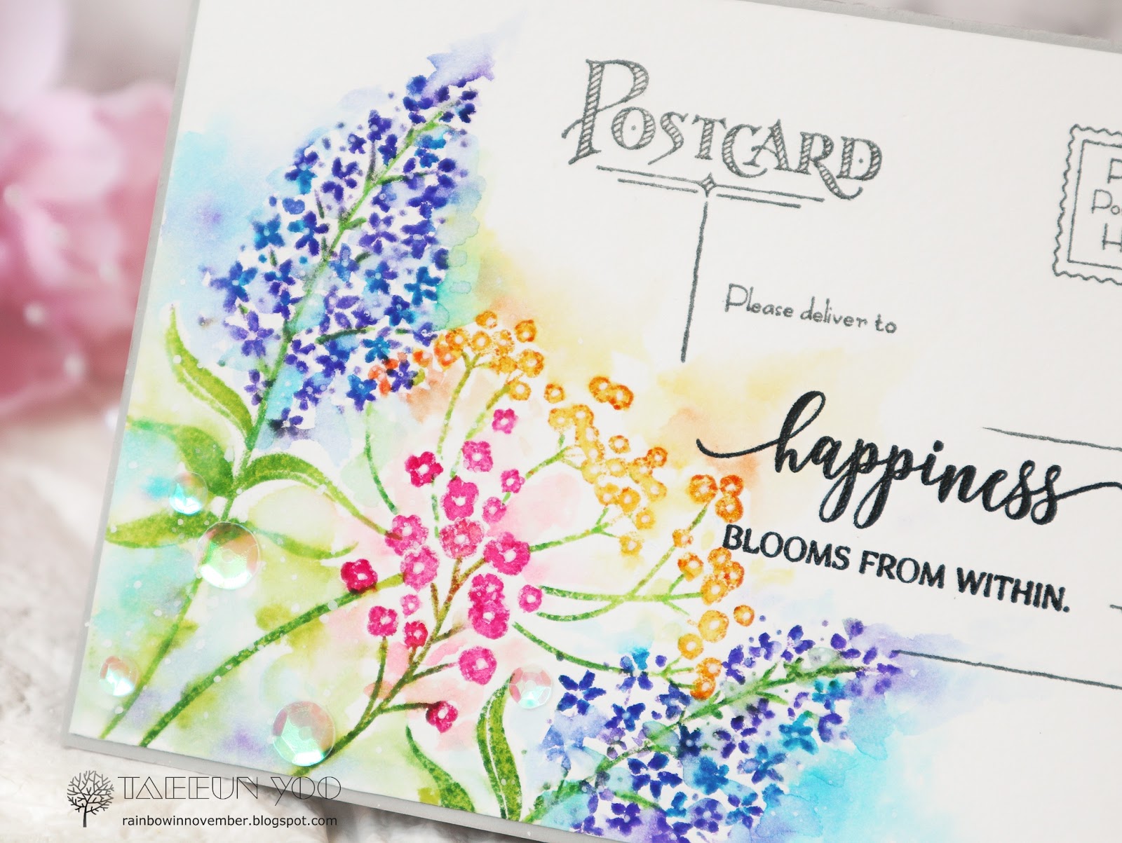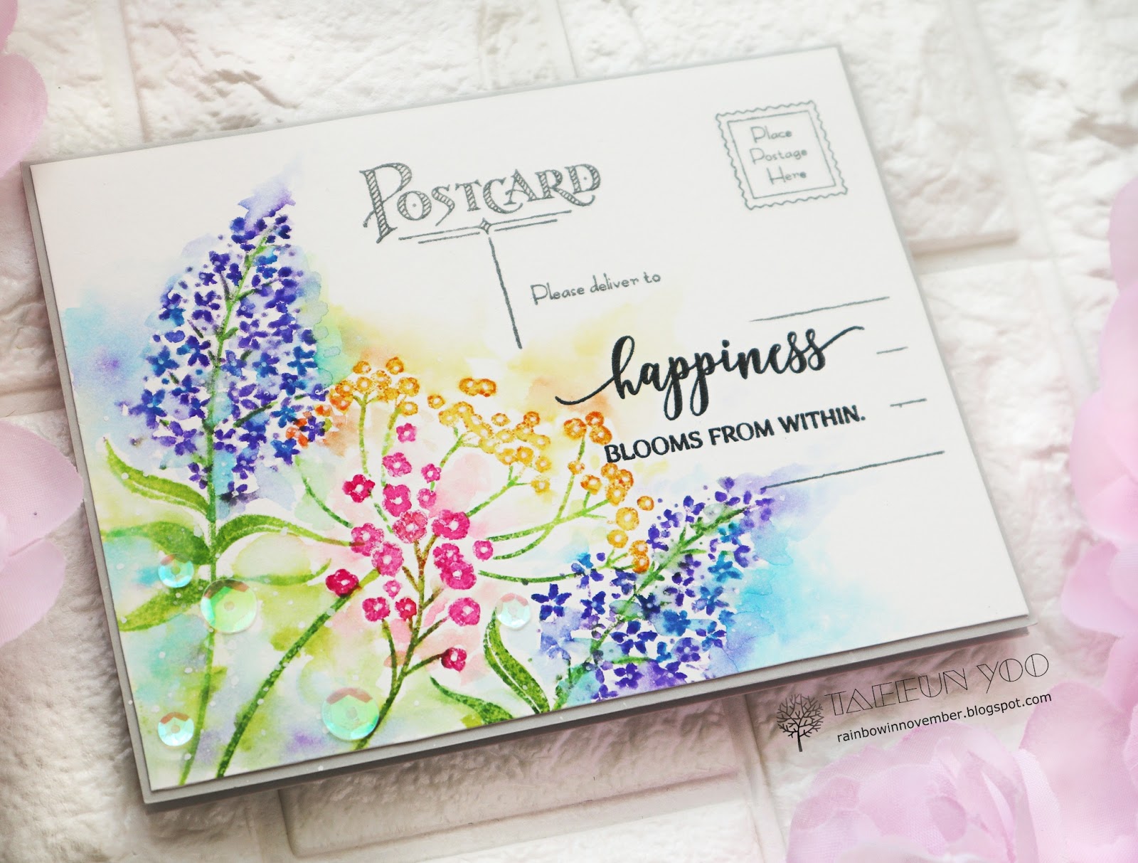 The last card for today is showing the Vintage Postcard (40-743) cling stamp set and the Secret Garden (30-682) stamp set.