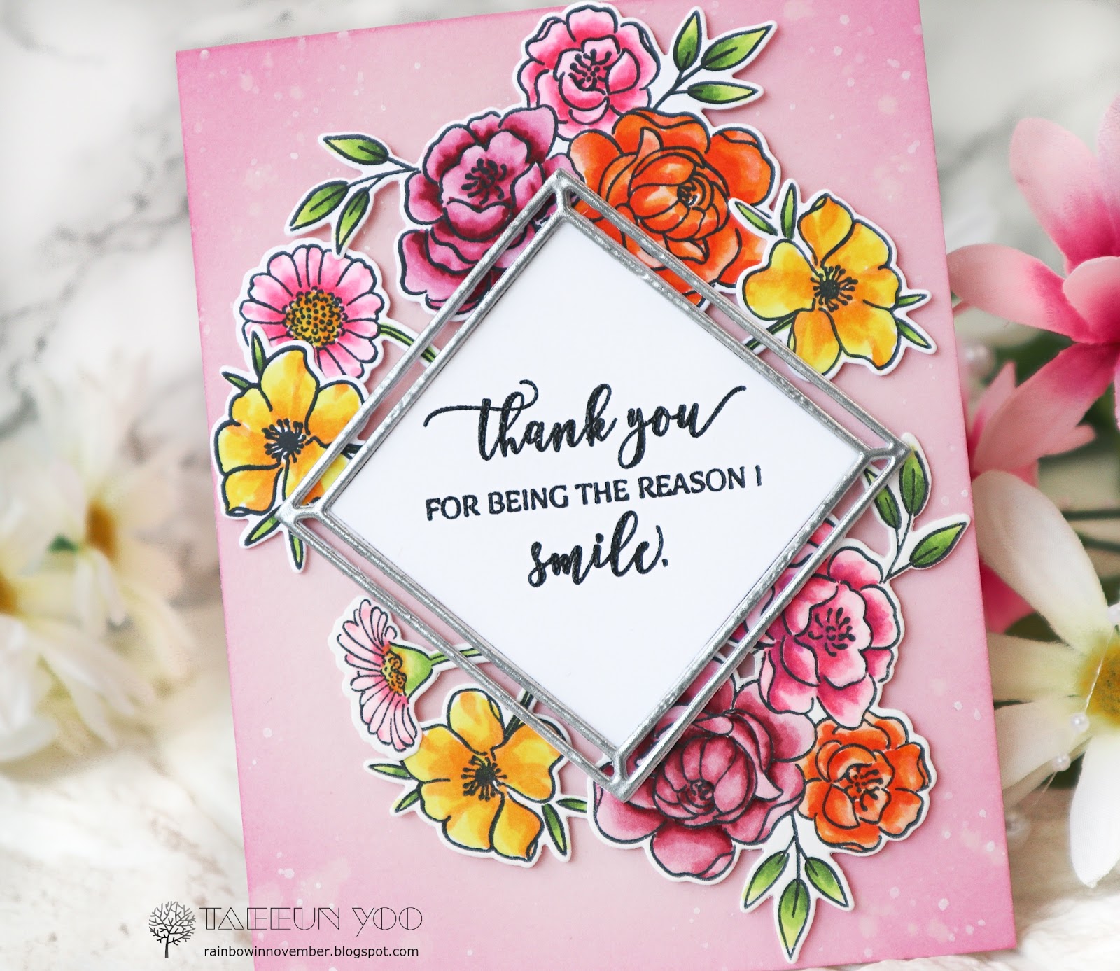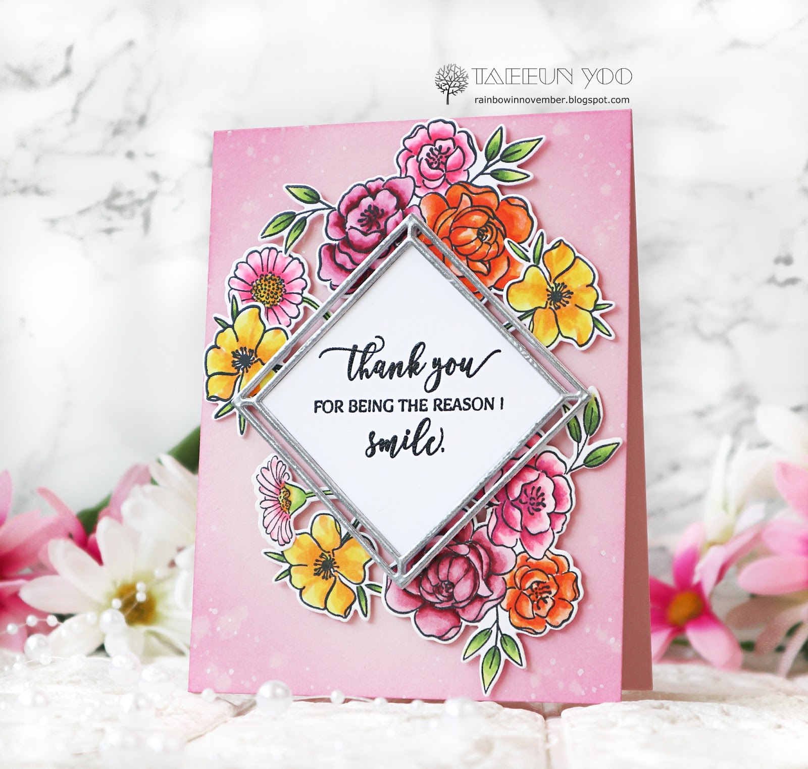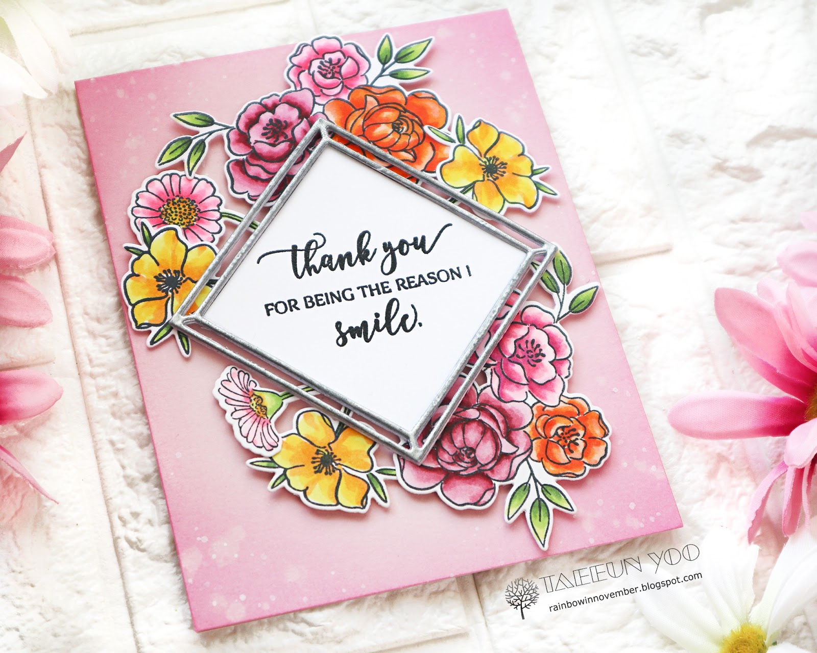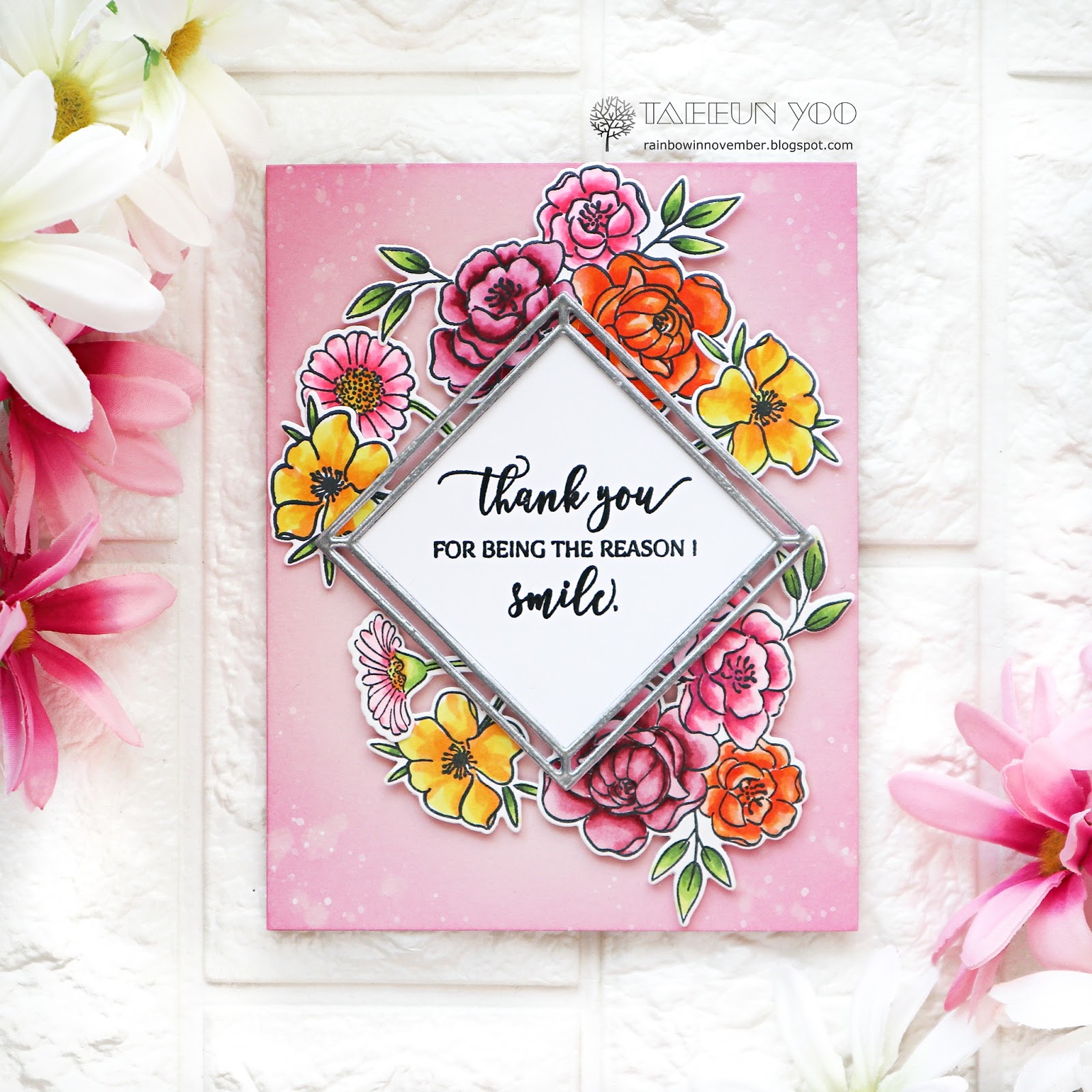 Next card is featuring Framed (51-622) die set, the flowers from Wings & Vases (30-704) set and the Daisy Collection (30-696) mini clear stamp set.
