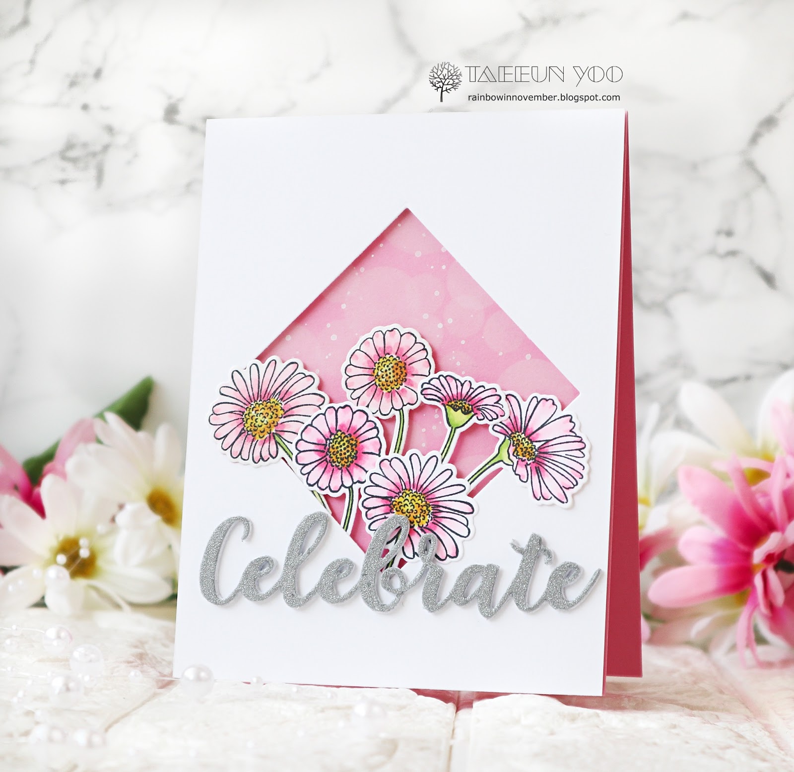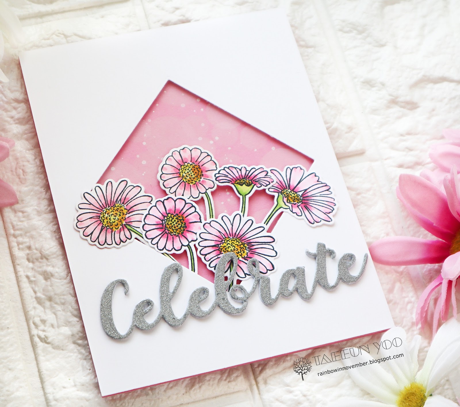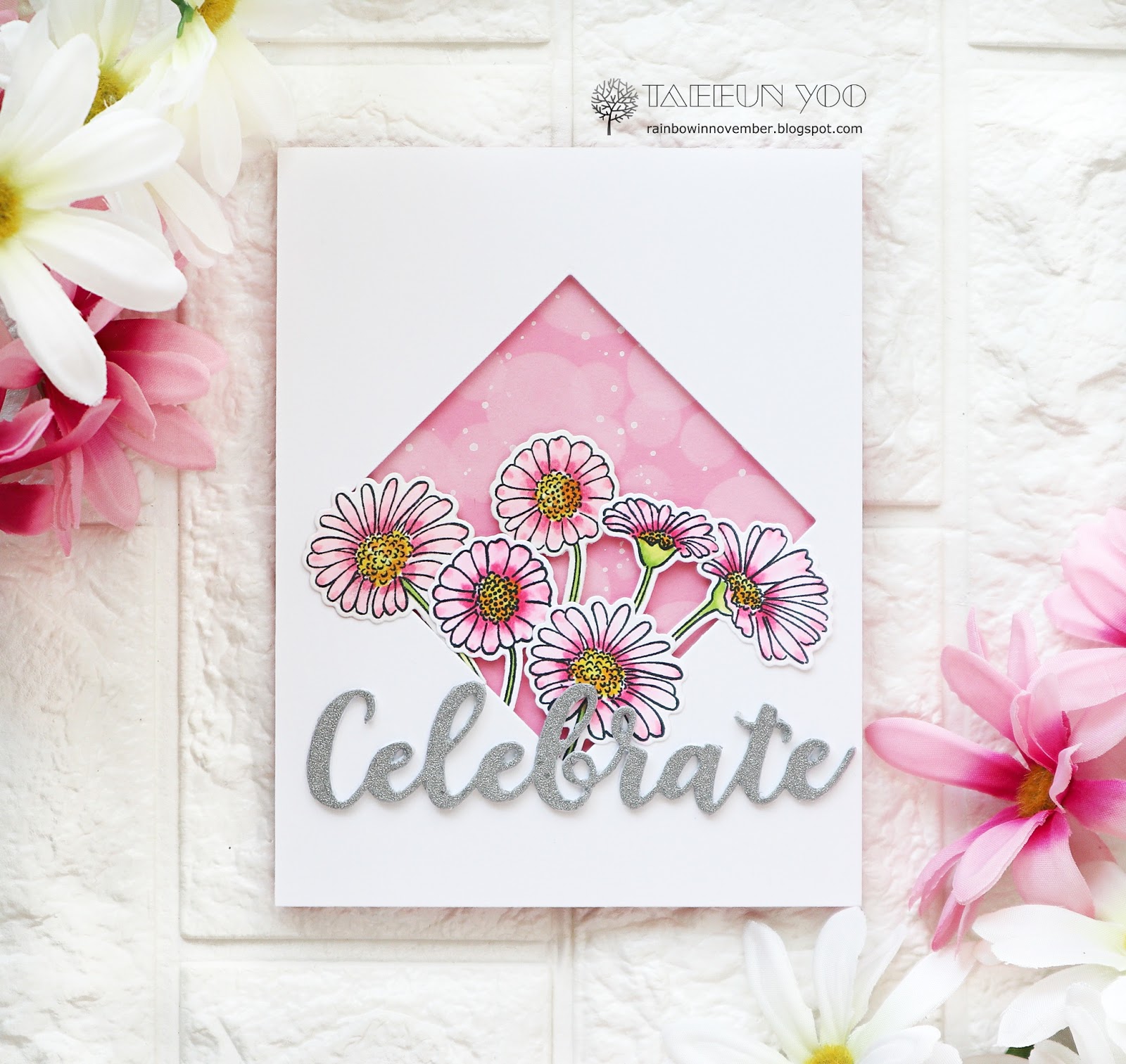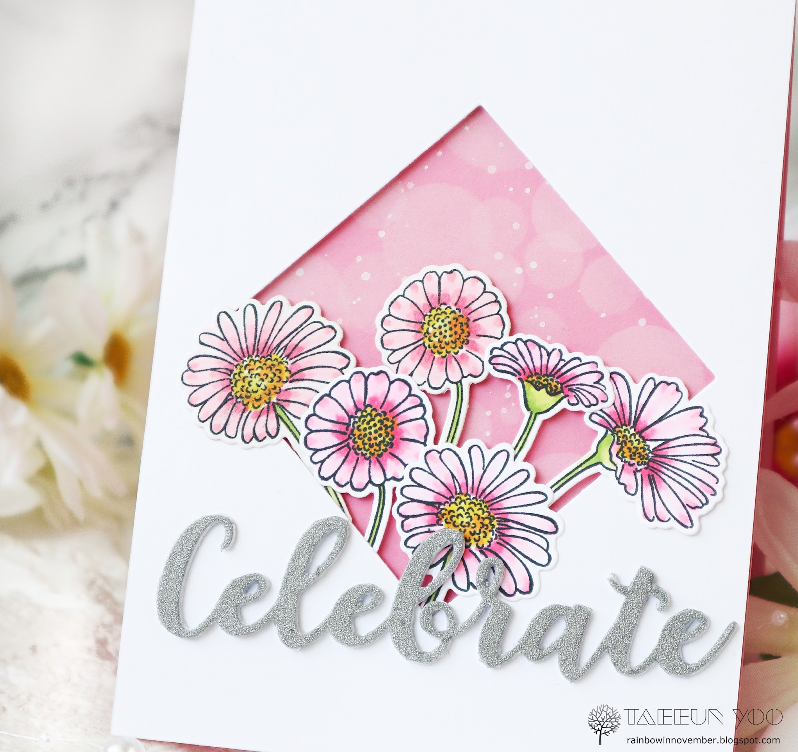 I created a bokeh background on a pink cardbase using white pigment ink and home made circle stencil. I splattered white opaque ink too. I arranged the daisies in the rhombic window of the front panel, adhered them on the back of the panel and foam mounted it on the cardbase.