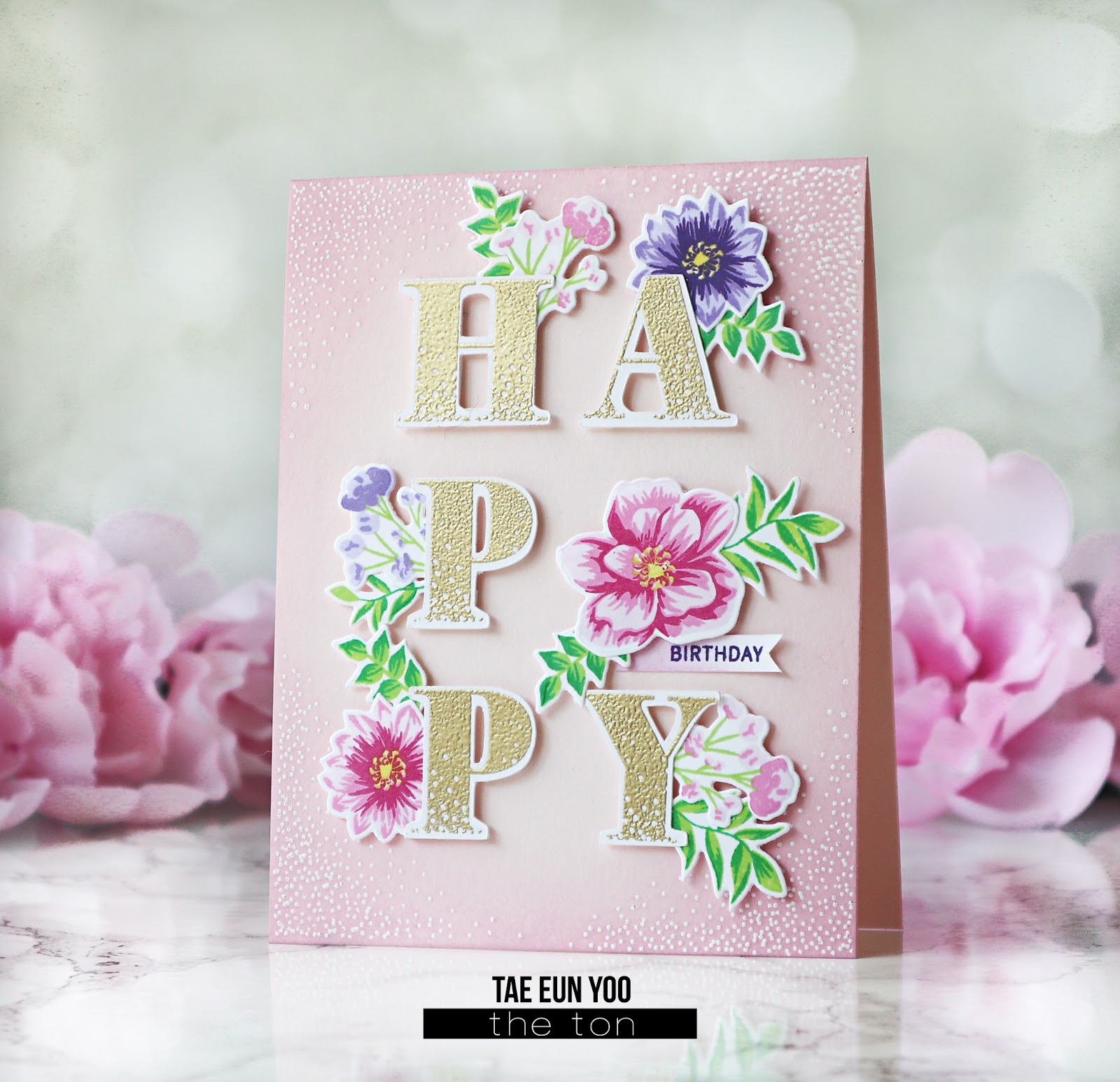 After stamping I cut the Floral Bits 2 images with the coordinating die. I then embellished each alphabet of the “happy” with the flowers and leaves.