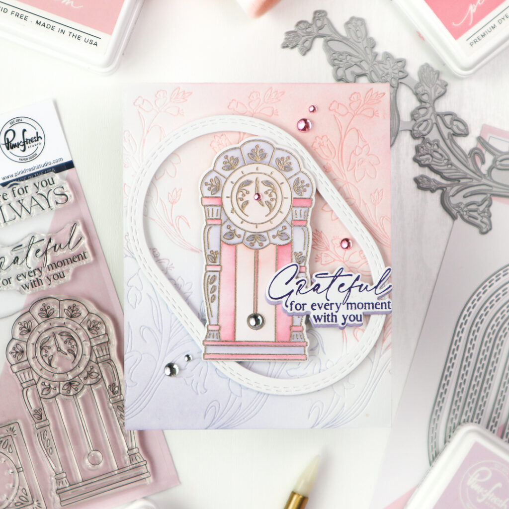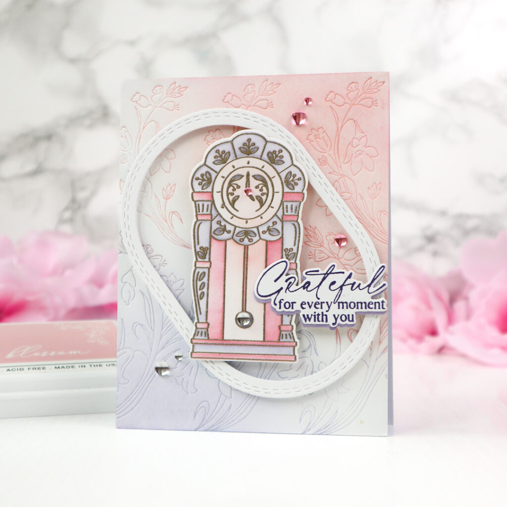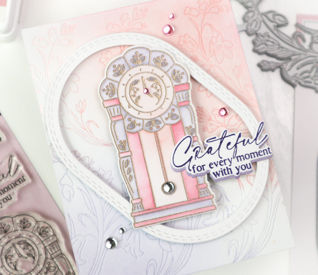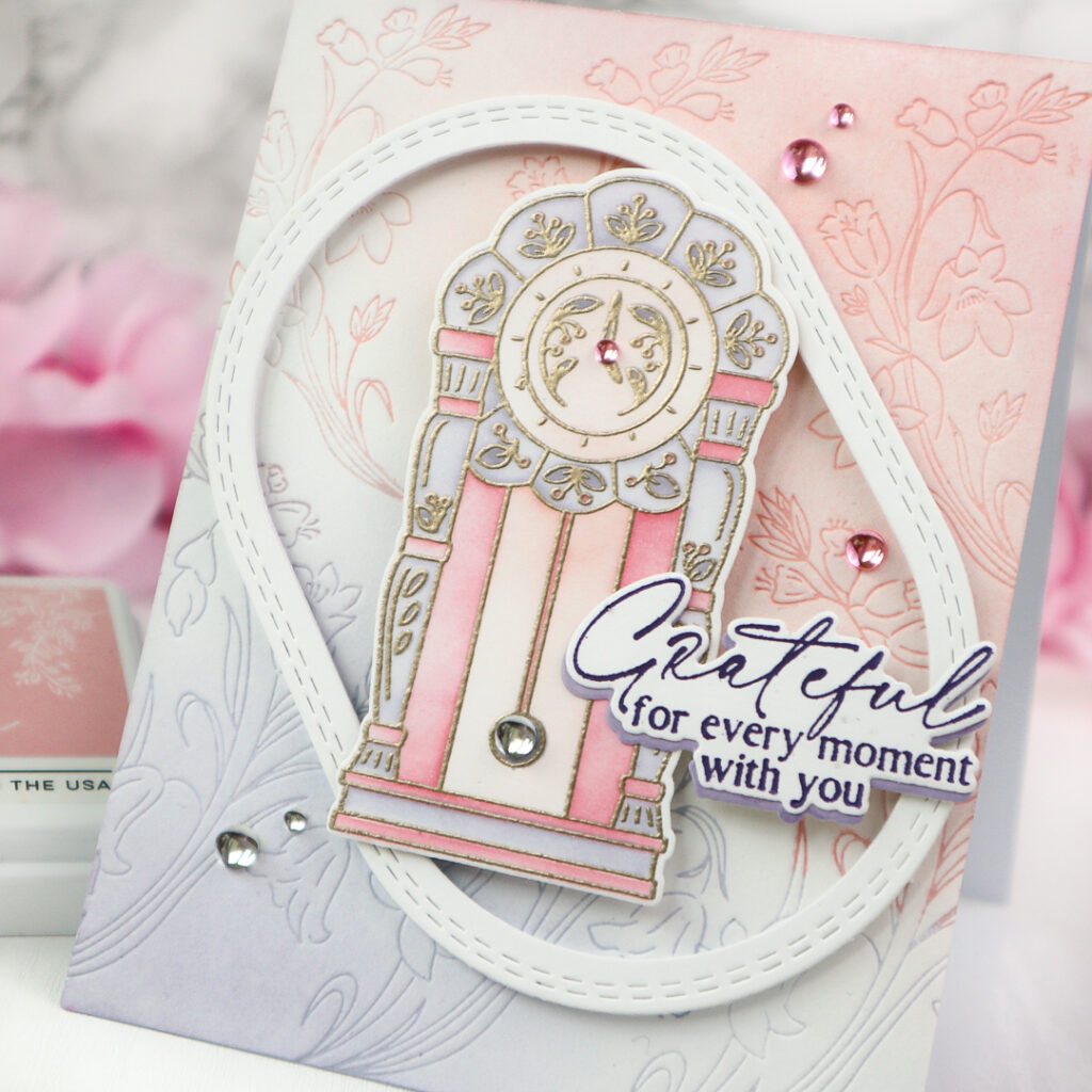 To start this card, I heat embossed the pendulum clock image in gold. I then used the coordinating stencils to add color, blending coral pink and purple gray shades using Cherry Blossom, Peony, Sheer Freesia, Wisteria, and Misty Coast. Once stenciled, I cut out the image with the coordinating die and set it aside.