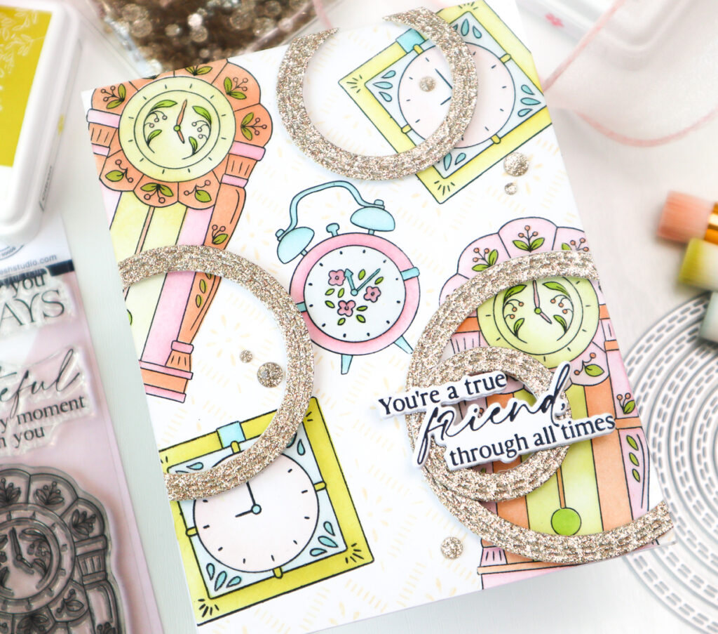 For embellishment, I die cut four glittery circular frames using the Double Stitched Circle Die and Champagne Glitter Cardstock. I arranged them over the clocks as shown in the photo, trimming off the excess.