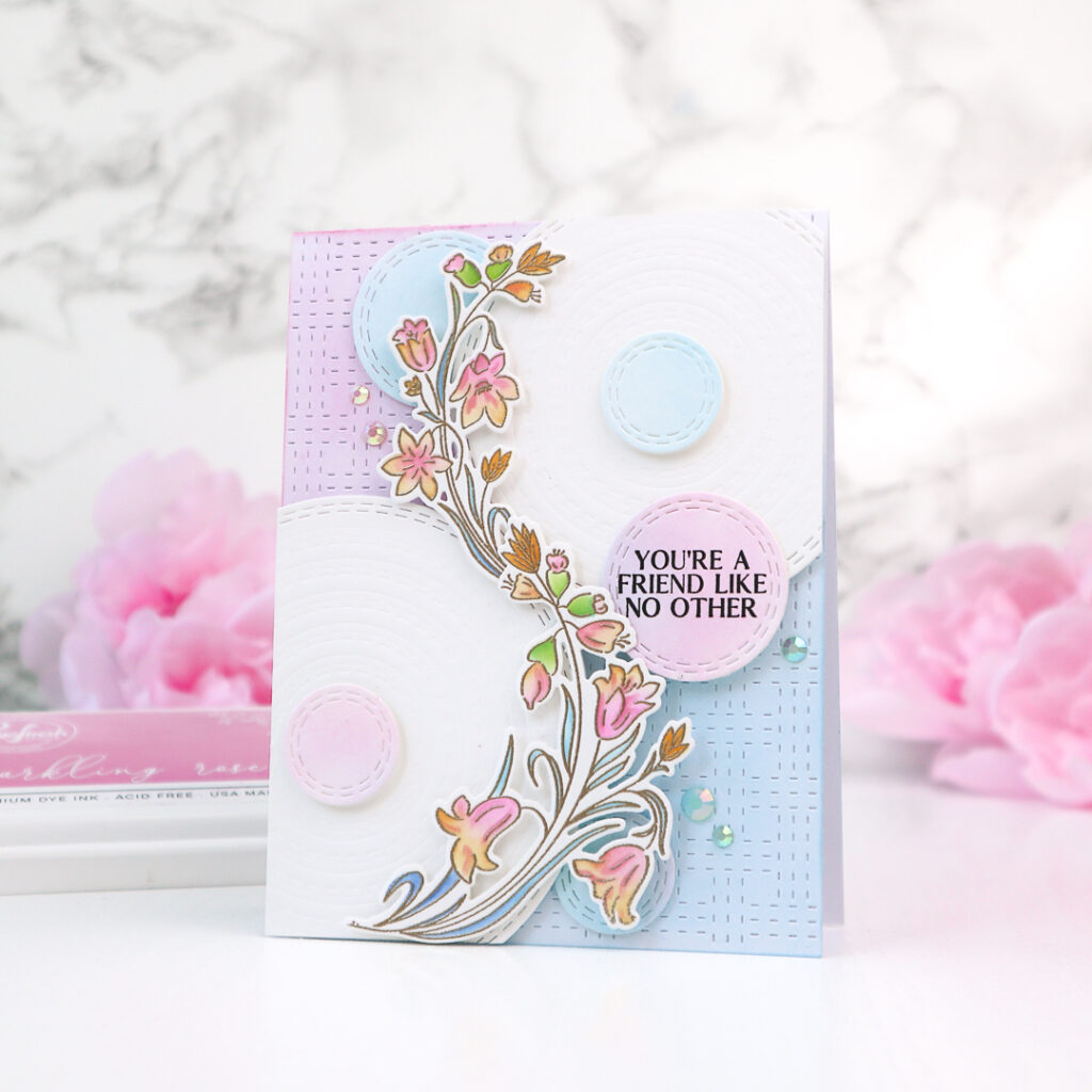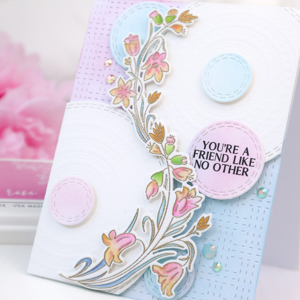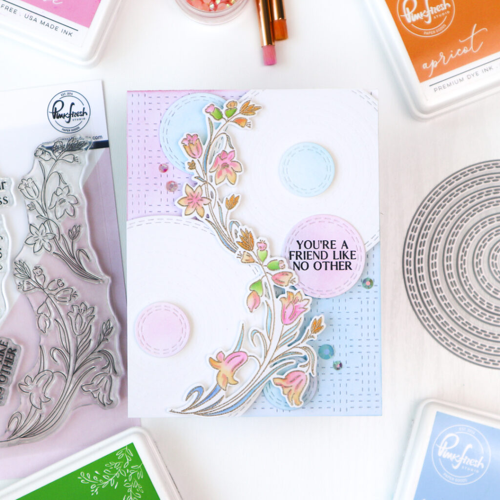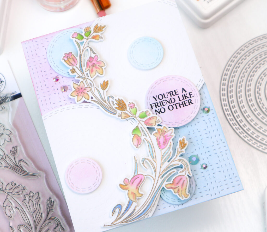 I’m on the Pinkfresh Studio Card Blog today with a soft and elegant card created with the Beautiful Soul product suite and the Double Stitched Circle die set from the latest release. This design blends dreamy pinks and blues with delicate floral arrangements layered over a geometric background !