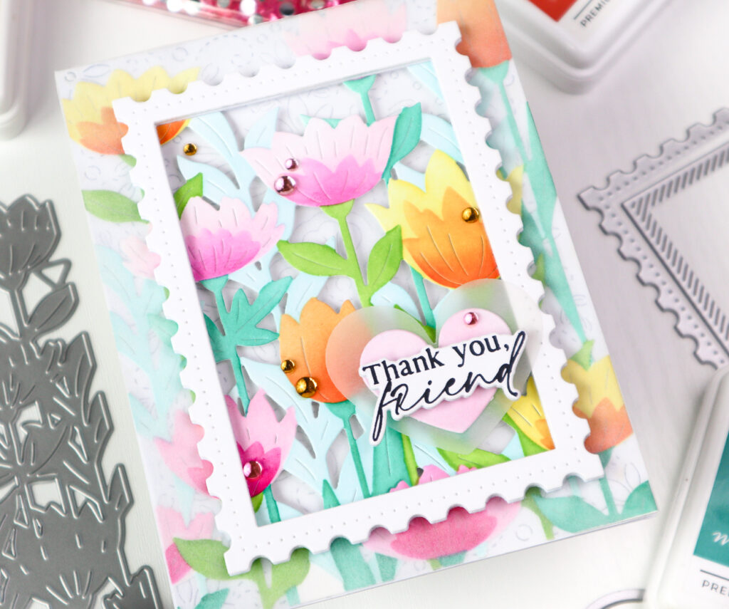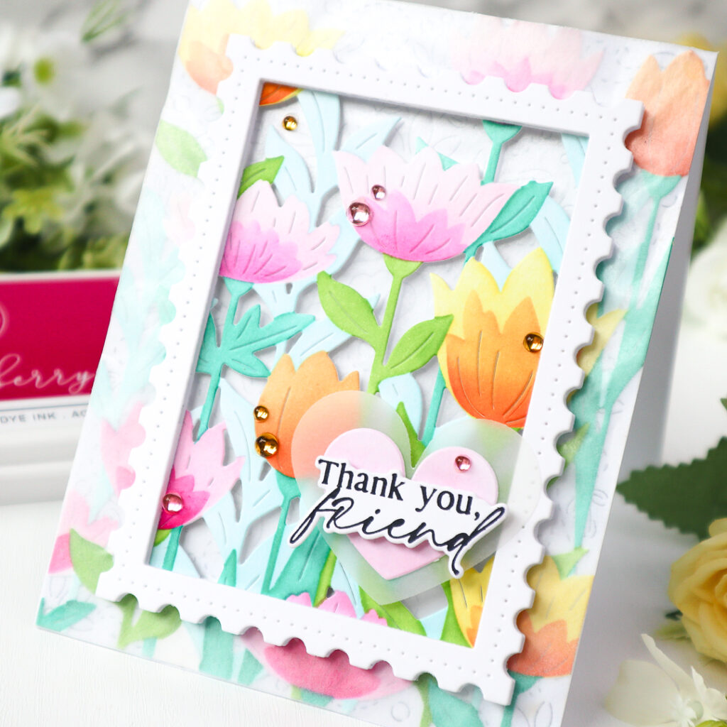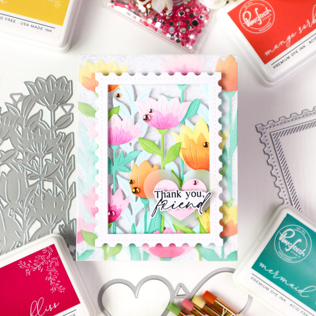 Today I’m sharing a floral thank you card on the Pinkfresh Studio Card Blog, inspired by Pinkfresh Studio May Challenge. The theme of this month is “Frame It Up”, paired with a fresh and cheerful color palette of teal, pink, and yellow. I used the Nested Rectangles: Postage Edge die to create my frame and layered a piece of vellum over the outer portion of the Floral Field image. This softens the background beautifully and gently draws the focus to the floral design within the frame 🙂 !