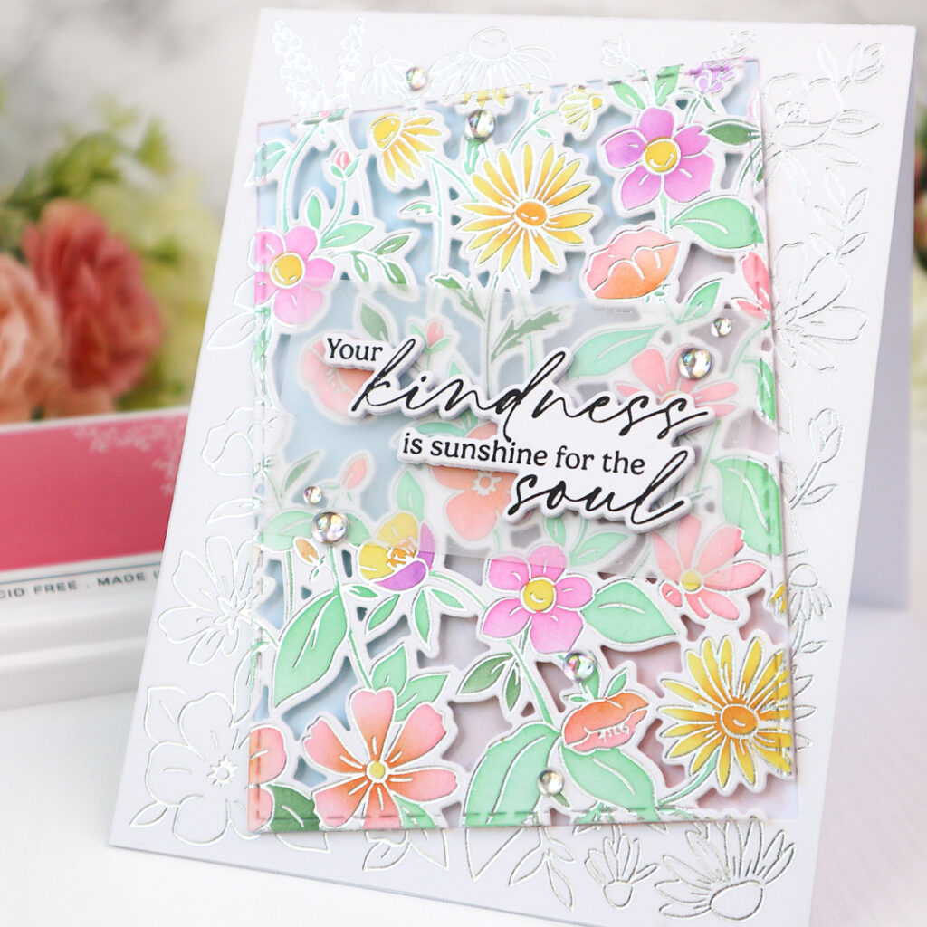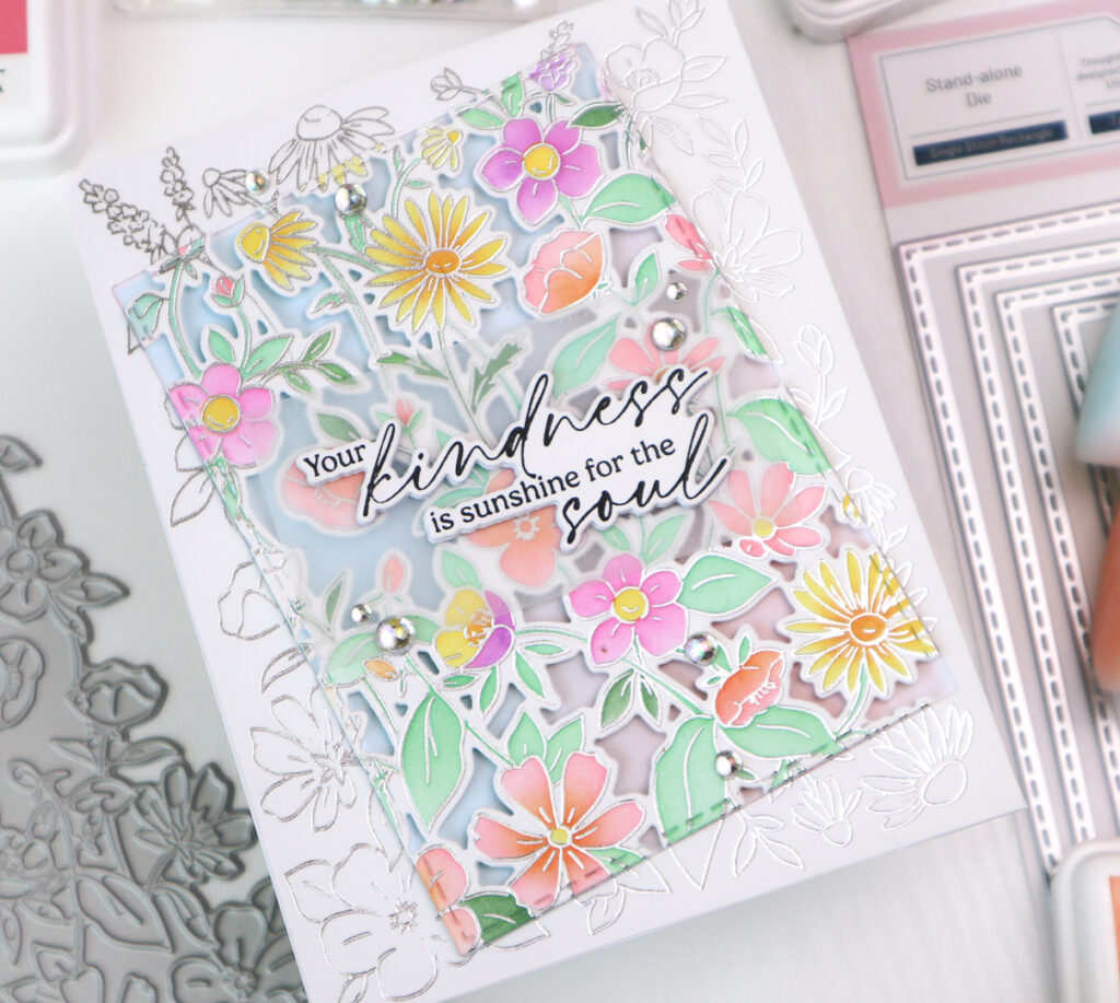 I started by hot foiling the Garden Medley in silver. Next, I die cut a slightly tilted rectangle from the panel—just as shown in the picture—using a die from the Essentials: Single Stitch Rectangles set. I then stenciled only the central rectangle using the Garden Medley stencils.