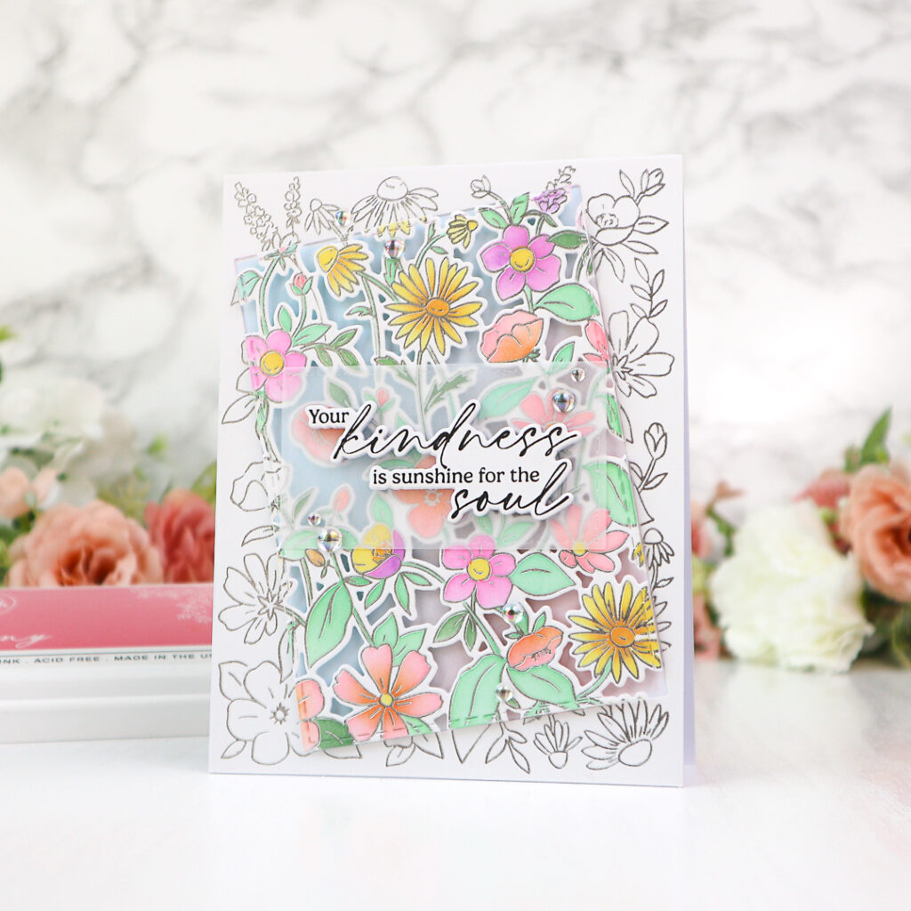 1. A great mix of the hot foiling with the flowers beautifully coloured using the coordinating stencils and with a very softly coloured background behind the flowers and I love the stitched rectangle you used TaeEun, and then to finish the lovely stamped sentiment layered and added onto the vellum which allows the coloured flowers to show through…a great idea. x