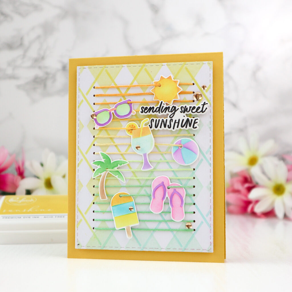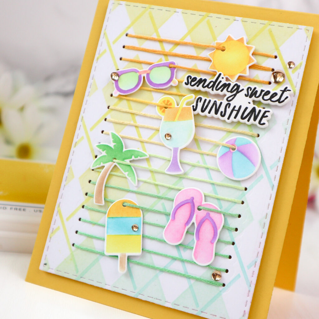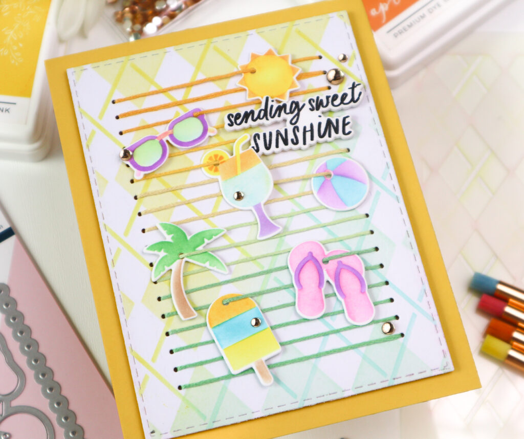 I used the Summer Fun suite to create this card. The suite includes a stencil set and coordinating die set, featuring cute summery elements like sunglasses, popsicles, flip-flops, and palm tree. Each die cut piece has a tiny hole, allowing you to hang them for a fun, decorative effect. I also used the dotted-edge rectangle die to add stitching around the background panel and weave in the die cut elements.
