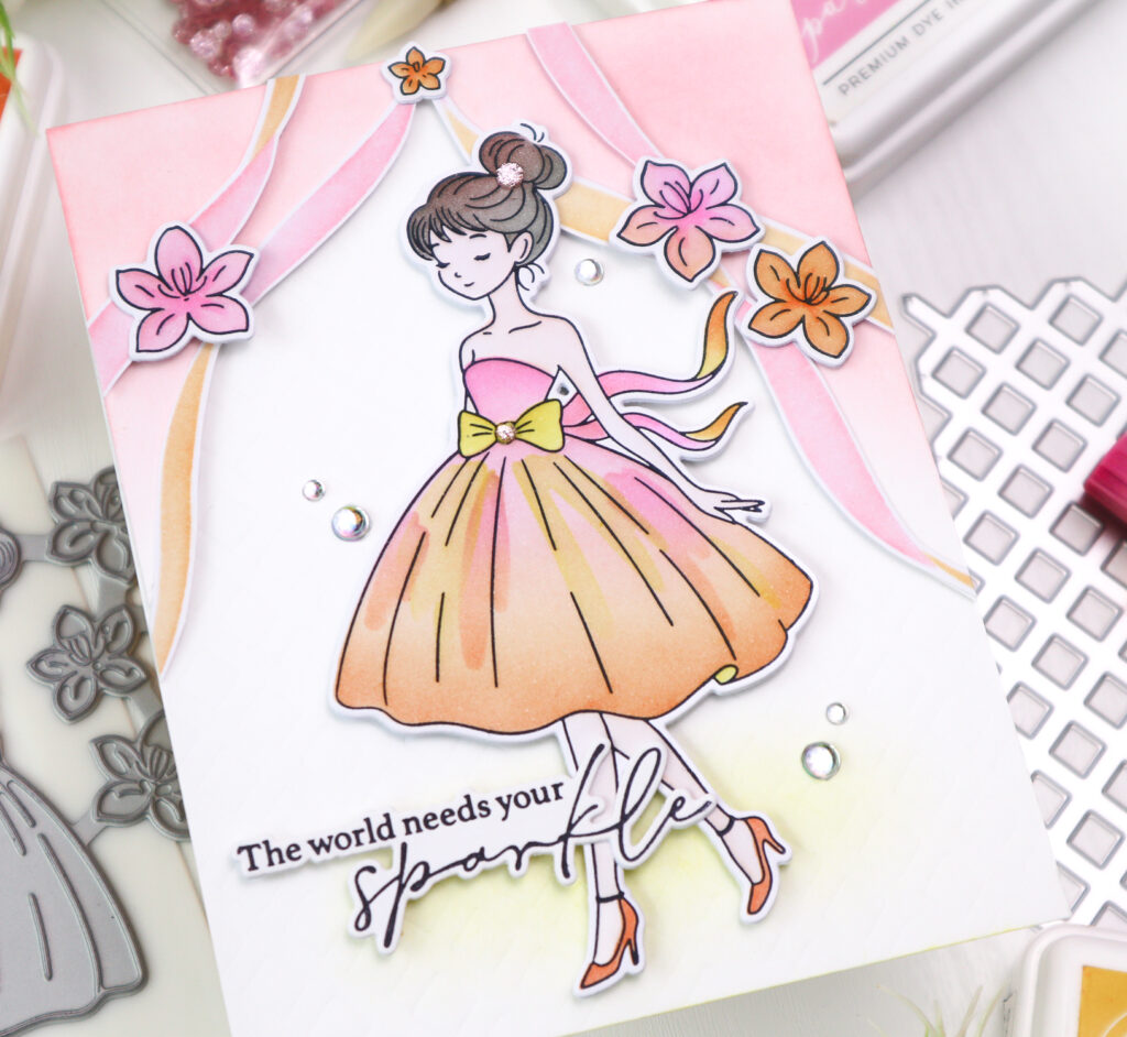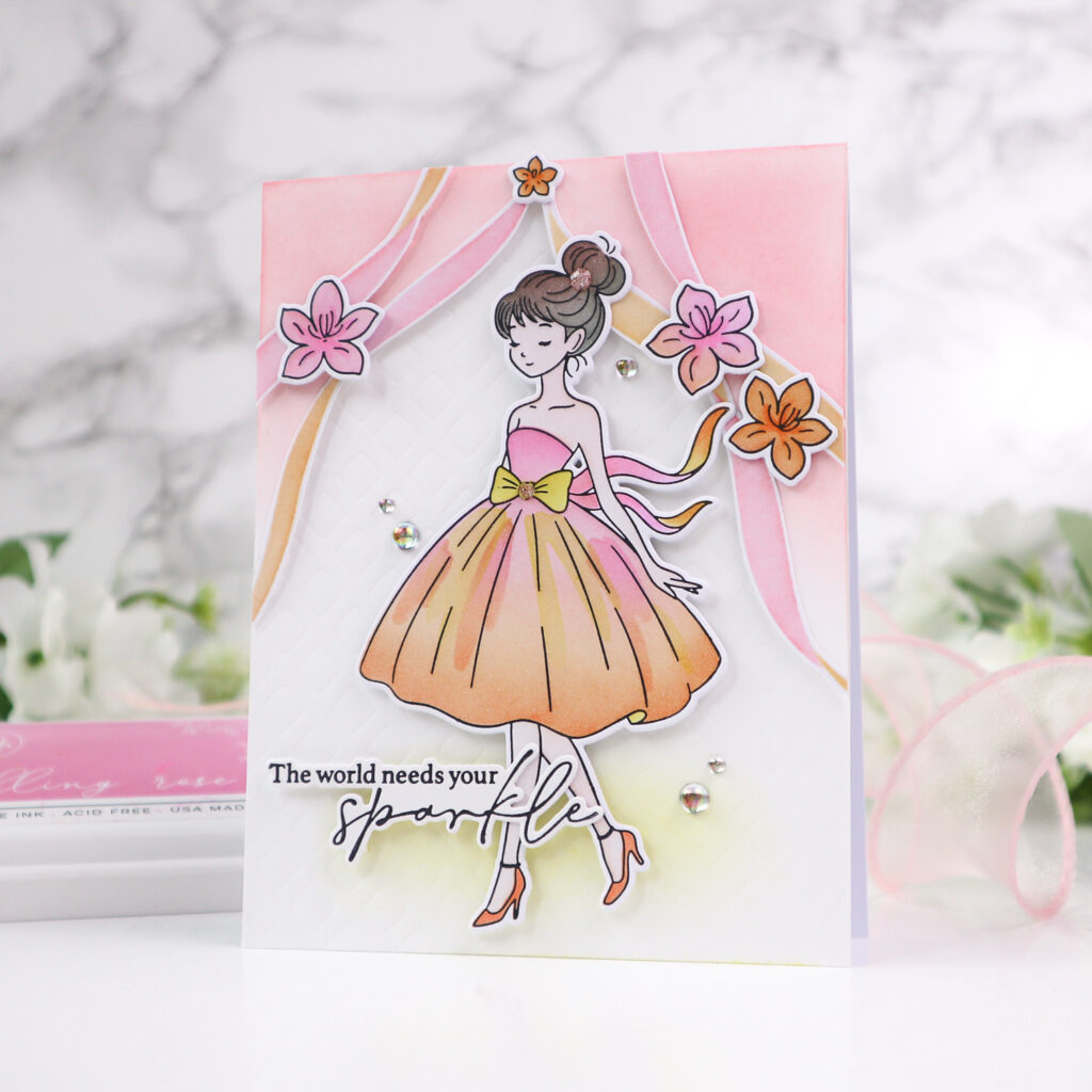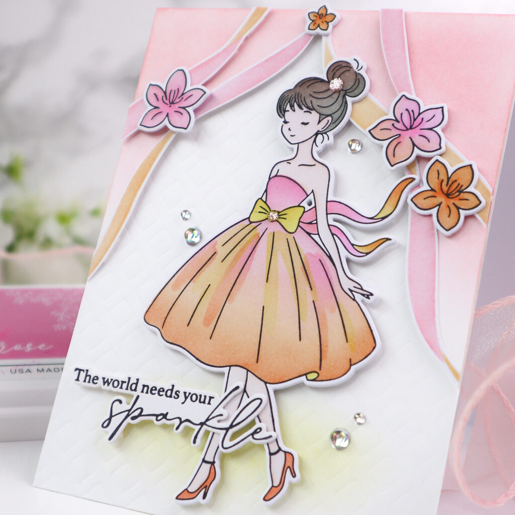 I began by pressing the Couture Grace Press Plate in Detail Black onto white cardstock, then colored the images using the coordinating stencil set. I kept a pink-orange color palette throughout the entire card for a cohesive look.