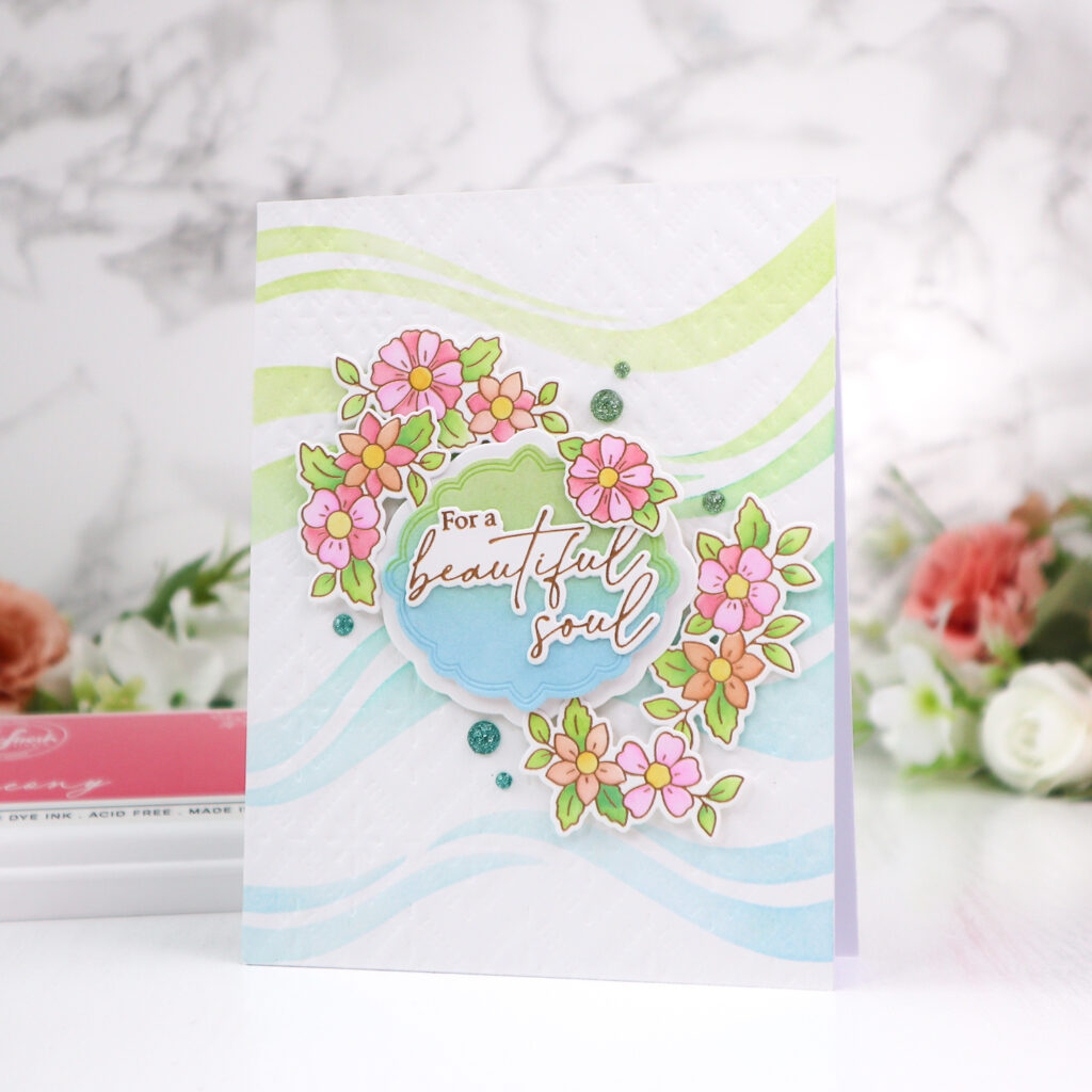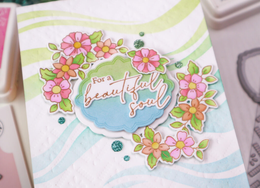 To complete the design, I arranged the floral clusters in the upper left and lower right corners around the frame, adding one flower slightly overlapping the sentiment for extra interest. I finished the card with a few Leaf and Aqua Glitter Drops for added shine.
