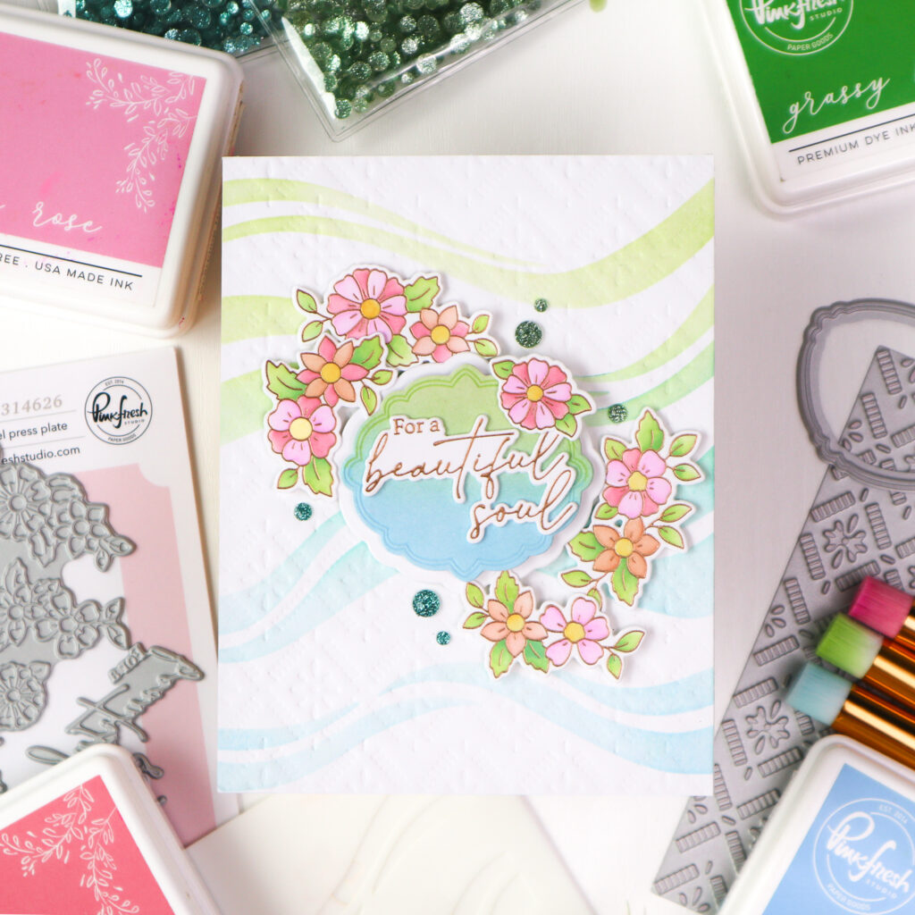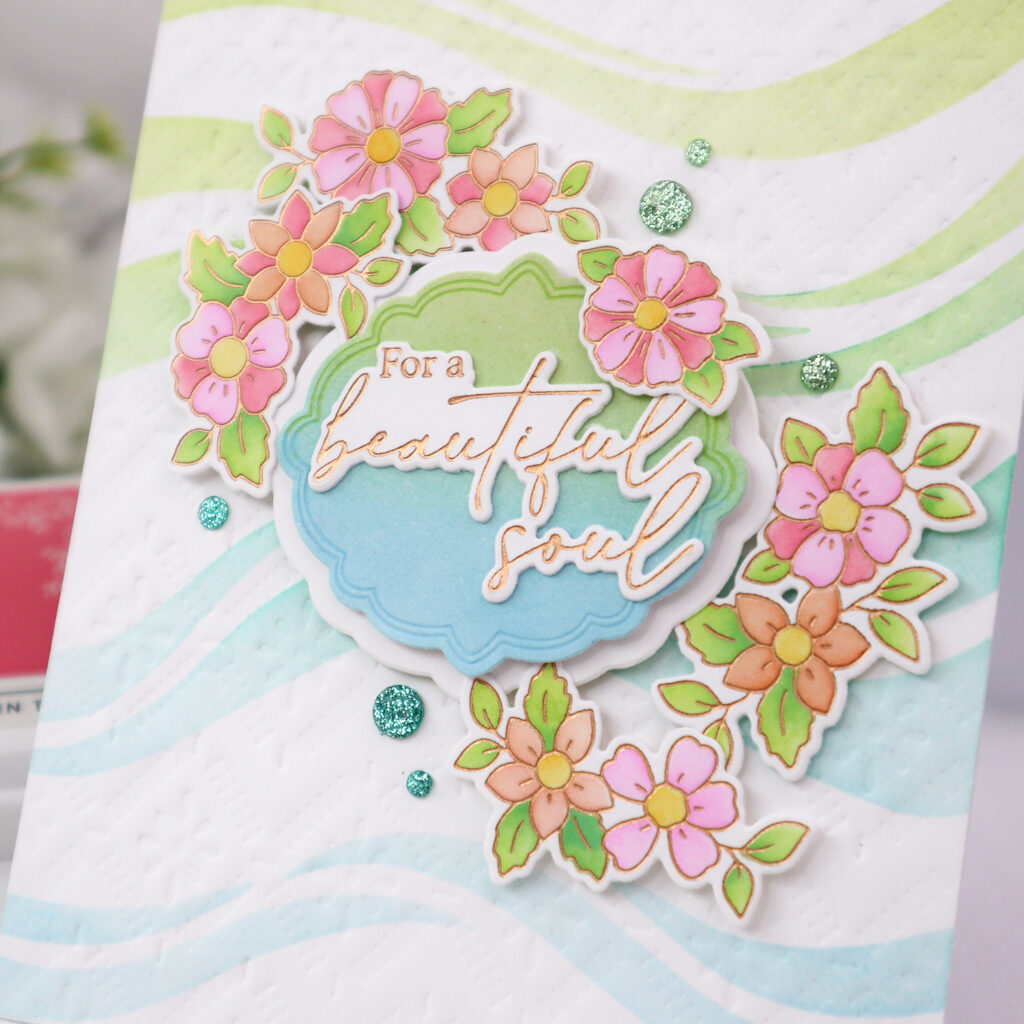 The floral elements were hot foiled in Rose Gold and colored using the coordinating stencil set. The petals were stenciled using Peony, Coral Reef, and Sparkling Rose, while the leaves were blended in Grassy Knoll with a touch of Summer Shower. The flower centers were colored in Marigold. Once finished, I die cut the images with the coordinating die.