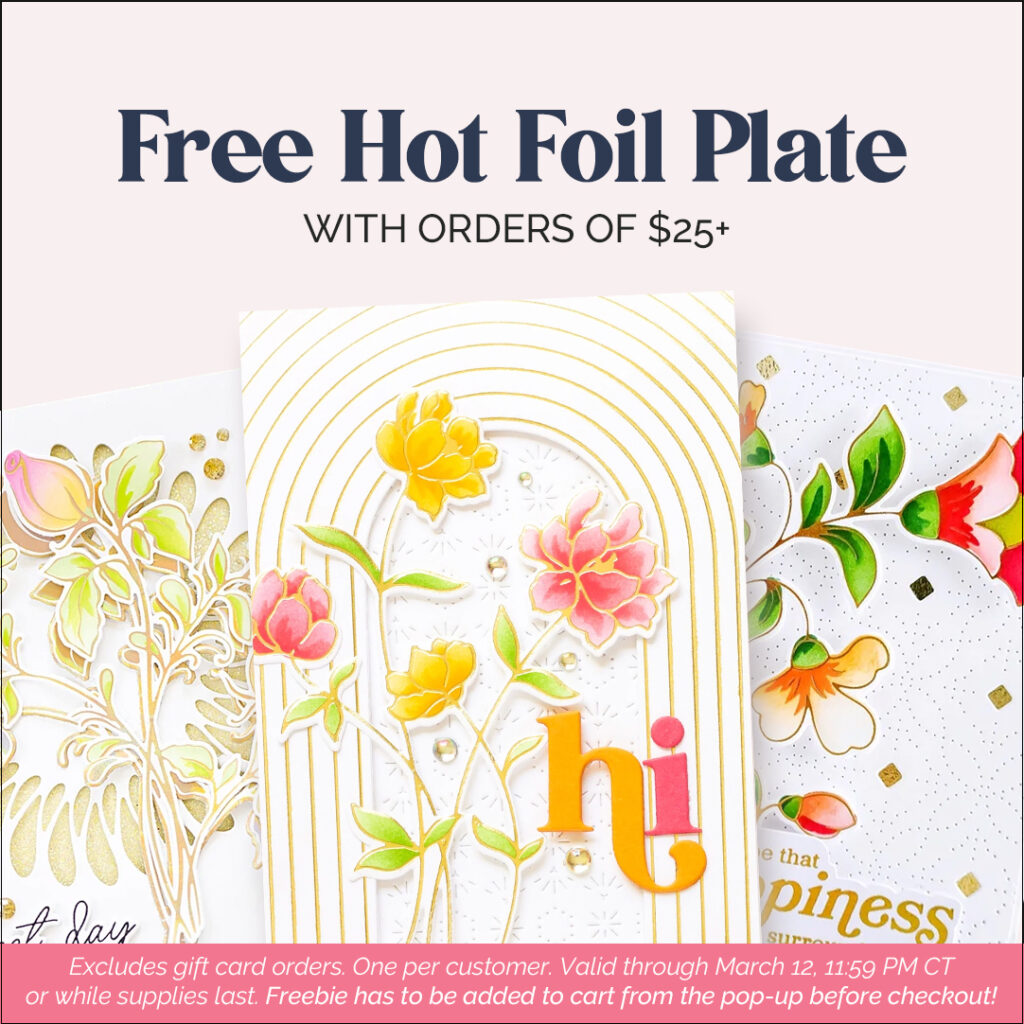 You can receive a free hot foil plate when you place an order of $25 or more (excluding gift cards) through March 12, 11:59 PM CT, while supplies last.