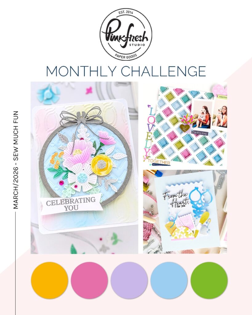 Today I’m sharing a bright and happy card inspired by the Pinkfresh Studio March 2026 Challenge! The theme is Sew Much Fun with a pretty pastel color palette. In February, Pinkfresh Studio released a unique collection that makes every sewing crafter’s heart happy, and this challenge is the perfect opportunity to use those new goodies!