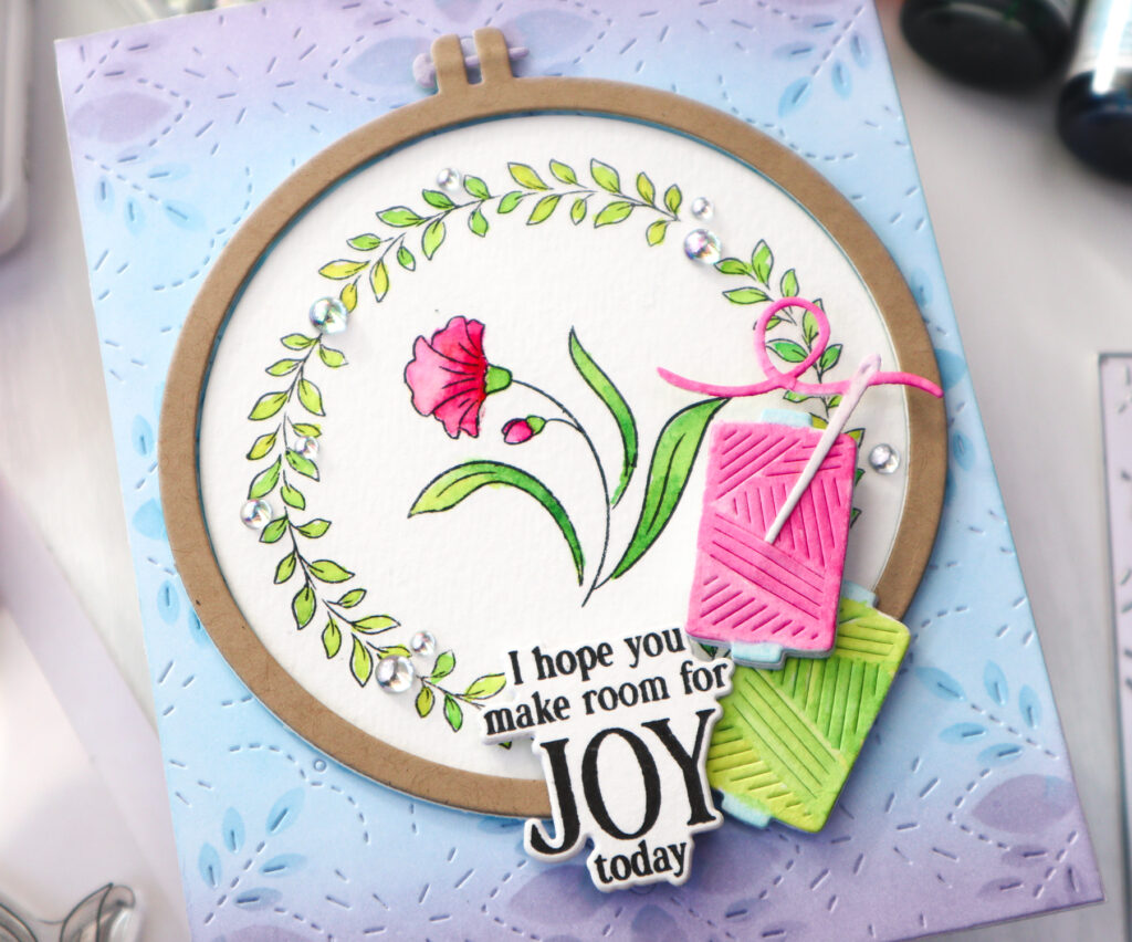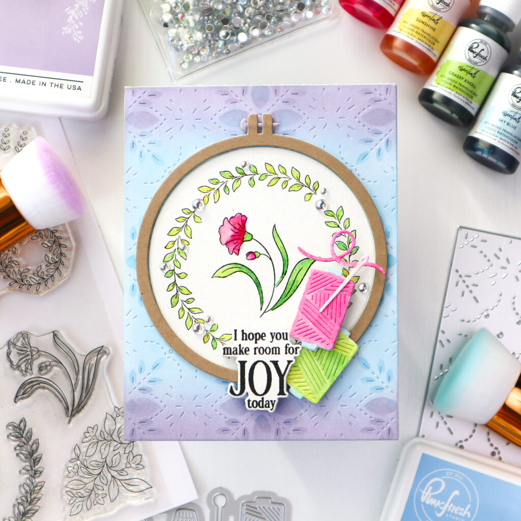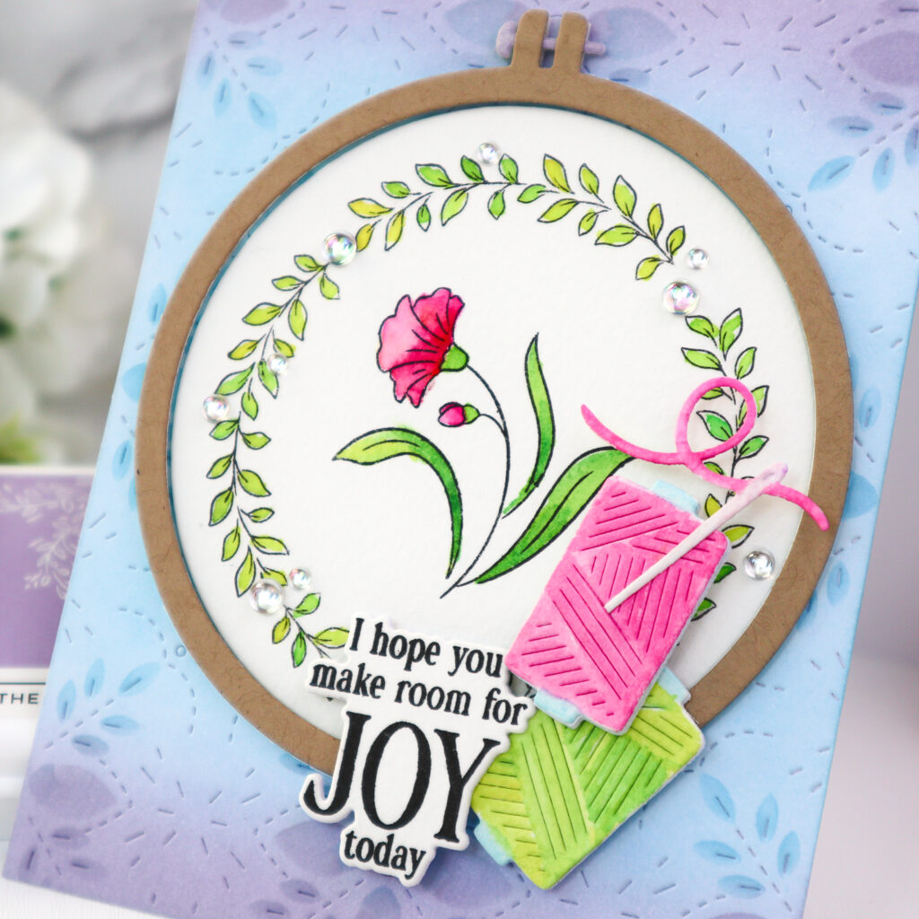 I watercolored a small floral image, framed it with the Embroidery Hoop, and added two spools of thread and a needle to give the impression that the floral image is being stitched. I also followed the challenge color palette for my card. You can use the theme, the colors, both or neither—it’s totally up to you, as the Pinkfresh Studio monthly challenge is an Anything Goes Challenge! The theme and colors are simply there to inspire you! Just make sure to use primarily Pinkfresh Studio products!
